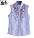 Shein sans manches top femmes d'été de femmes blouses tops bleu rayé à volants garniture bande brodée col sans manches blouse