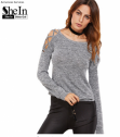 SheIn Femmes Manches Longues Tops Femmes Vêtements Automne Casual T-shirt Gris Chiné Croisillon Creux Out Ouvrir Épaule T-shirt