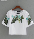 2017 Nouveau Femmes Élégant Vestidos Feuilles Broderie Court chemisier chemises à manches courtes o cou Blusas Femininas slim tops SB1053
