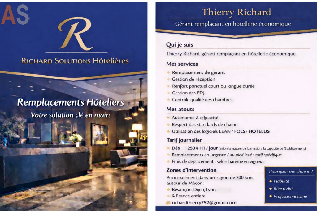 Je propose mes services de gérance remplaçant pour hôtels et établissements hôteliers en Saône-et-Loire.