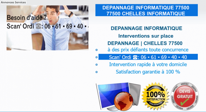 Contactez nous à fin d'analyse et corriger ce que l'on peut appeler dysfonctionnements perçus qui vous empêche d'utiliser correctement votre ordinateur. Grâce à notre expérience et à notre équipement à la fine pointe de la technologie, notre savoir-faire souvent imité mais jamais égalé! , Scan' Ordi nous est en mesure de vous offrir le meilleur service de réparation informatique qui soit à tout nos clients sur chelles 77500 et aux alentours de chelles 7 Jours /7j de 8H à 22H30